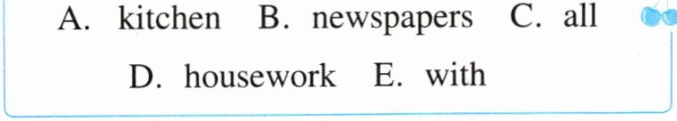 Hello, I'm Judy. My mom and dad are busy every day. So I often help them to do some 1. ________. Today is a sunny day. I'm doing my homework and my mom is doing the dishes in the 2. ________. My father is reading 3. ________. My little brother is playing 4. ________ his friends. And Lucky, our little dog, is enjoying the sunlight. We 5. ________ have a good day.