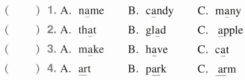 3. F 【点拨】A选项中a发/eɪ/,B、C中a发/æ/,故填F。