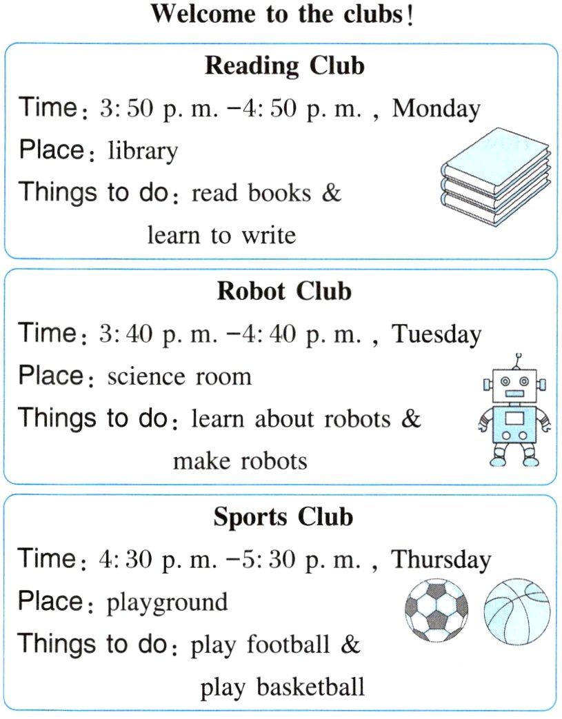 1. B 【点拨】由第二个方框“Time:3:40 p. m.-4:40 p. m. , Tuesday”可知周二下午机器人俱乐部有活动,故选B。