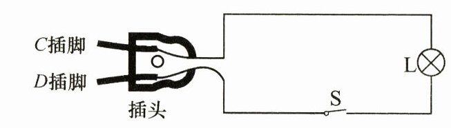 11.8教材P1110素材变式淄星改编如图所示,是一盏台灯的电路示意图,当把台灯接入电路时,为了安全,应将台灯插头的________(选填“C"或“D”)插脚接火线,该灯泡正常工作一段时间后,灯丝热得发红,而与之相连的导线却几乎不发热,这说明电流通过导体时产生的热量与________有关。若刚将插头插入插座时,该灯泡不发光且电路中的空气开关跳闸,则电路故障可能是______________。