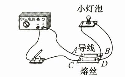 12.新考向创设情境淄星改编小米在学习了家庭电路这一章的知识后,在实验室里用电源、熔丝、导线和灯泡组成如图所示的电路来研究“短路引起熔丝熔断”的实验,电路熔断器中的熔丝应该选用熔点较________的材料制作,增加一根导线,并将导线接在________(选填ABCD中的两个)两点间闭合开关,造成短路,可引起熔丝熔断。除短路之外,____________________也会引起熔丝熔断。