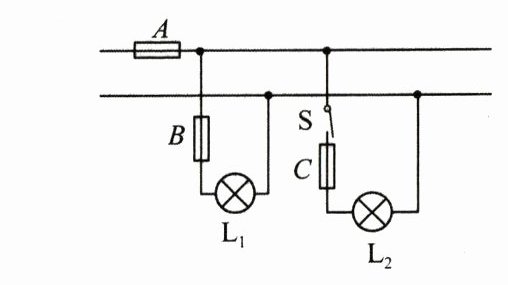 19. ★星改编(9分)如图所示,“6V 6W”的灯L₁与“6V 12W”的灯L₂都与2A的保险丝B、C串联,干路上是一根2A的保险丝A。断开S时,L₁正常发光(保险丝的电阻不计,忽略灯泡电阻的变化)。