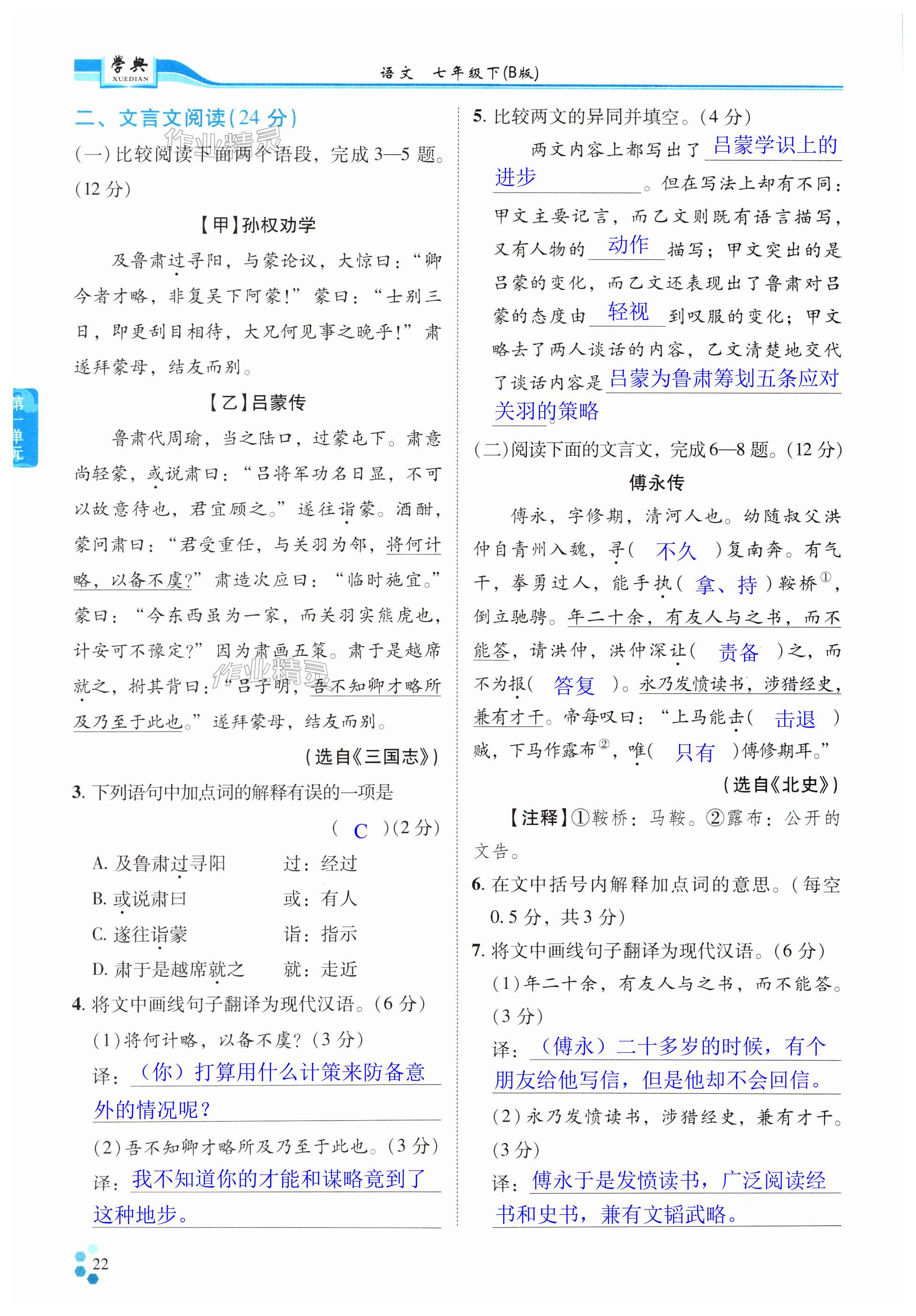 注:目前有些书本章节名称可能整理的还不是很完善,但都是按照顺序排列的,请同学们按照顺序仔细查找。练习册 2025年学典四川七年级语文下册人教版B版 答案主要是用来给同学们做完题方便对答案用的,请勿直接抄袭。