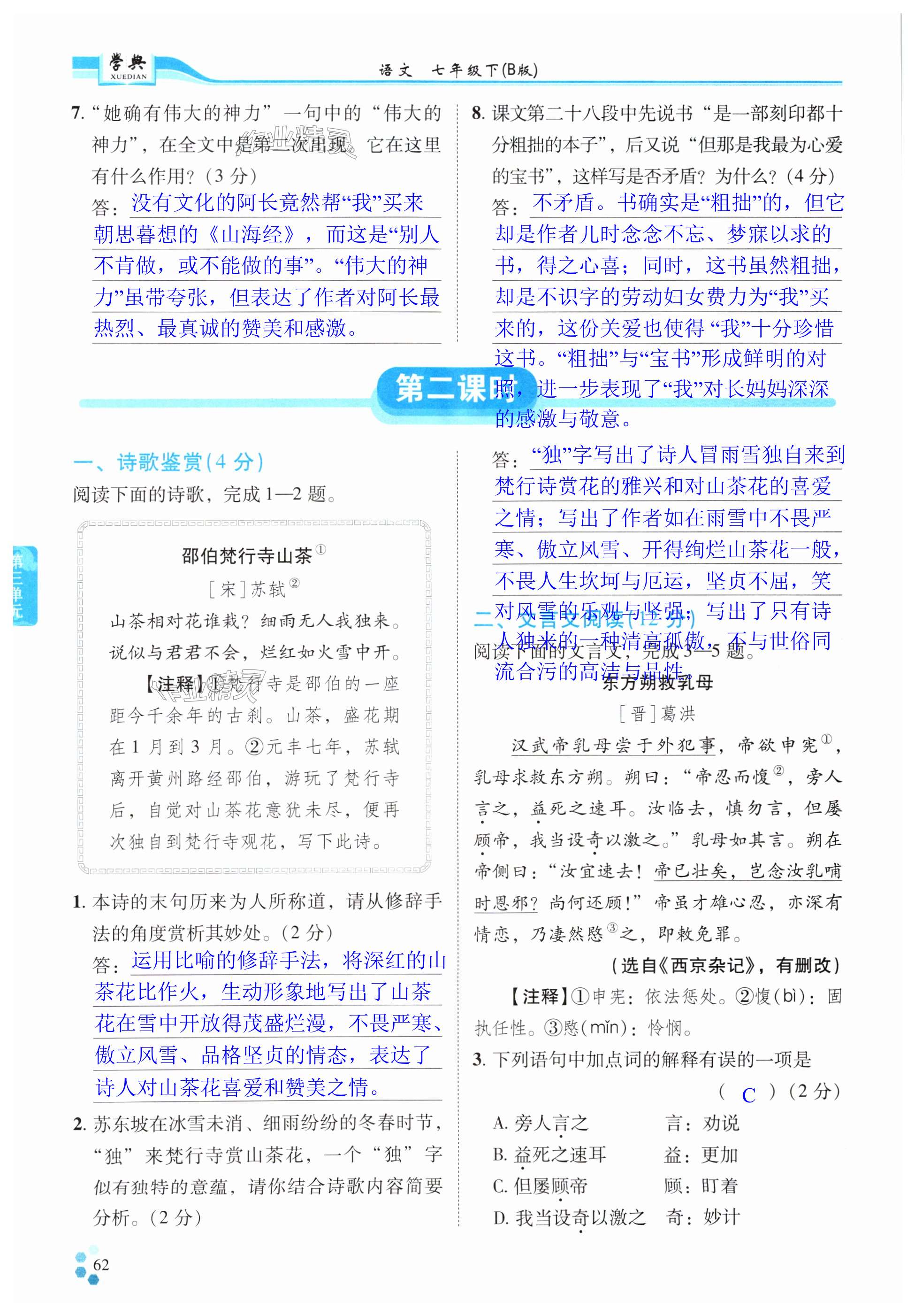 注:目前有些书本章节名称可能整理的还不是很完善,但都是按照顺序排列的,请同学们按照顺序仔细查找。练习册 2025年学典四川七年级语文下册人教版B版 答案主要是用来给同学们做完题方便对答案用的,请勿直接抄袭。
