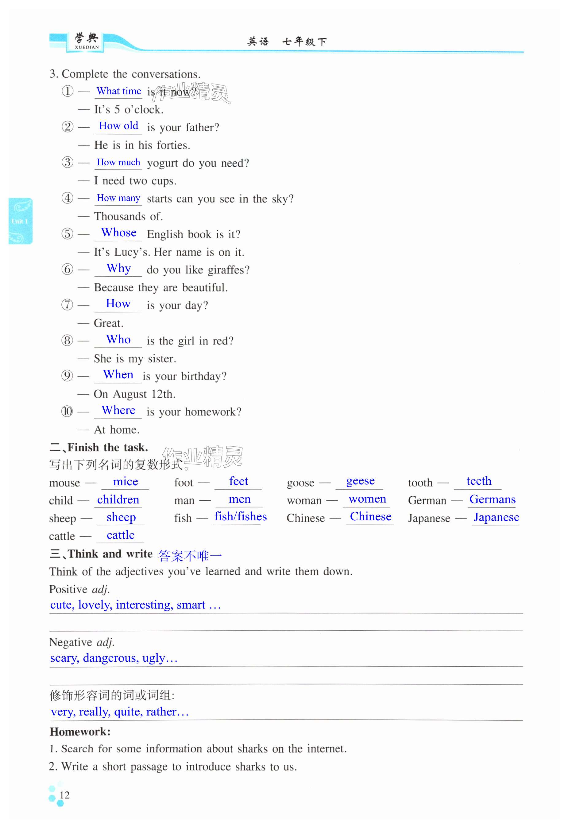 注:目前有些书本章节名称可能整理的还不是很完善,但都是按照顺序排列的,请同学们按照顺序仔细查找。练习册 2025年学典四川七年级英语下册人教版B版 答案主要是用来给同学们做完题方便对答案用的,请勿直接抄袭。
