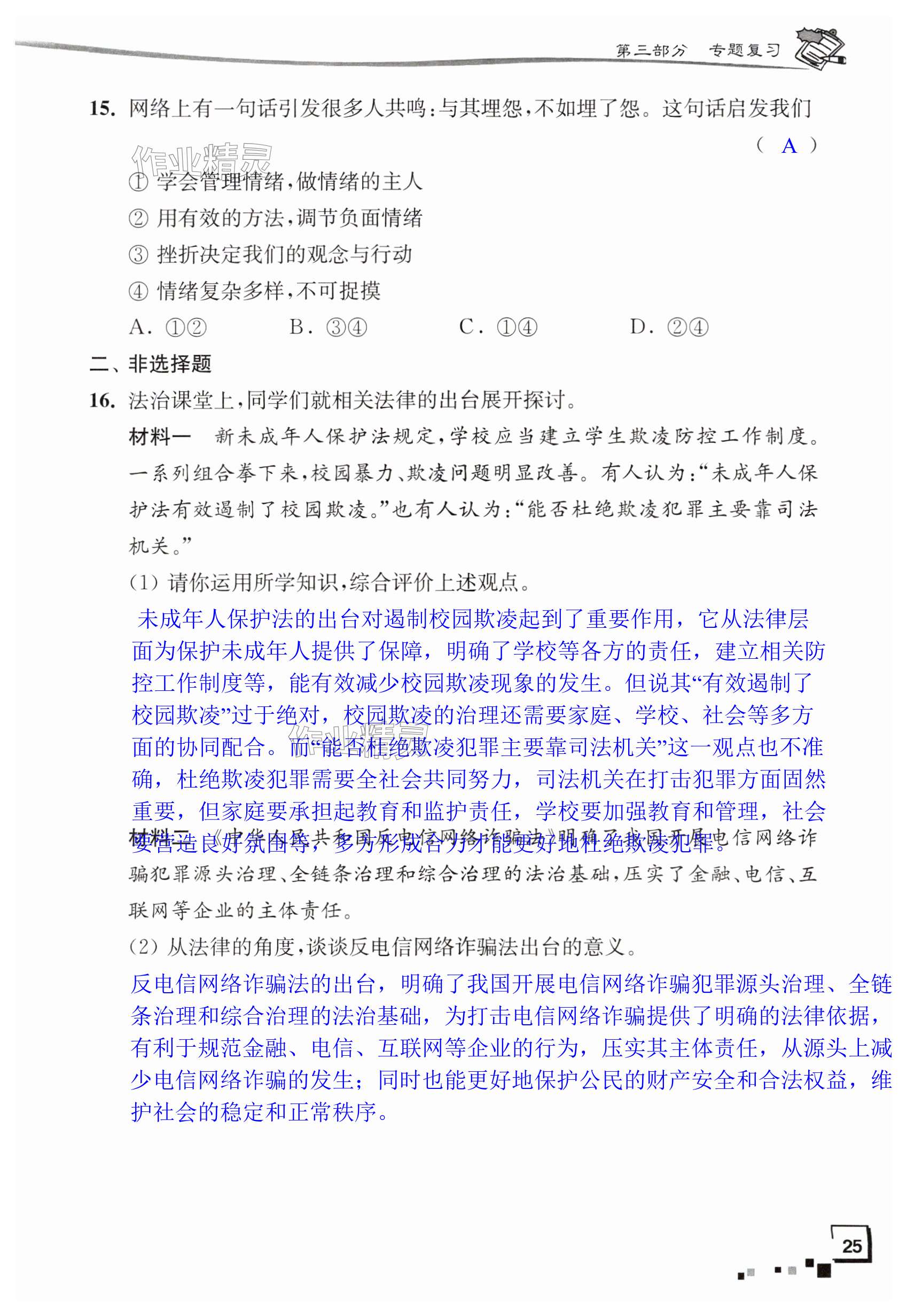 注:目前有些书本章节名称可能整理的还不是很完善,但都是按照顺序排列的,请同学们按照顺序仔细查找。练习册 2025年新中考复习指导与自主测评道德与法治 答案主要是用来给同学们做完题方便对答案用的,请勿直接抄袭。