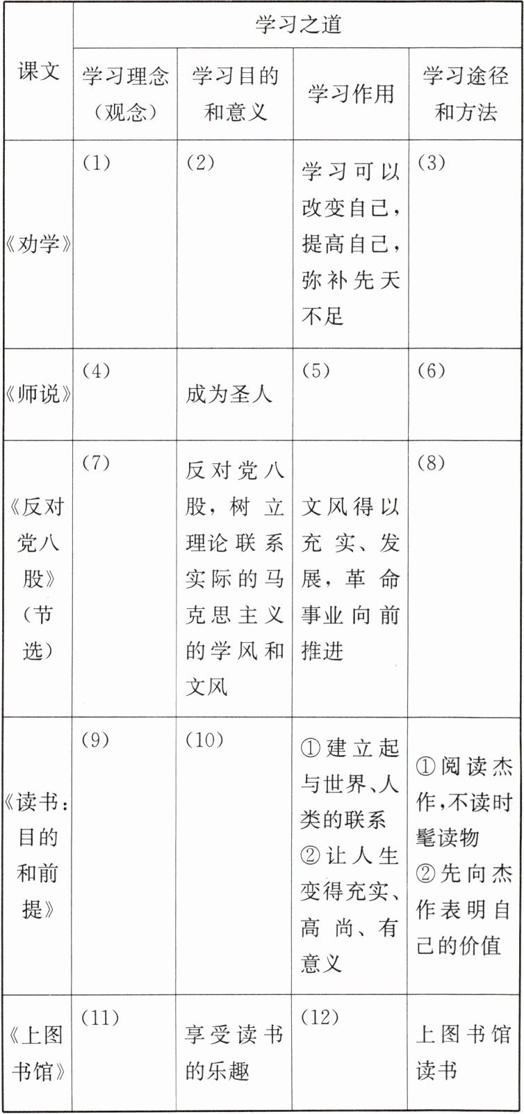1.本单元的课文都从不同角度阐述了“学习之道”,试结合课文内容填写下表。