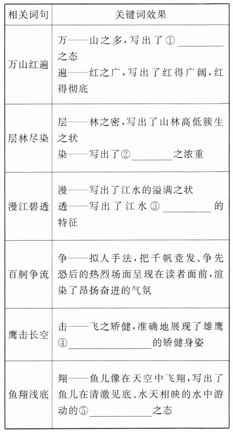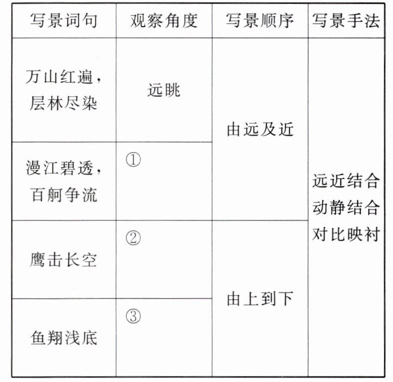 5.[赏析指导手法]本词上片作者是怎样来描绘眼前这大好的“湘江秋景图”的?请根据提示填写下表。