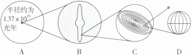 (2)层次:A表示 可观测宇宙 ,河外星系的级别与 银河系 相同(填字母);C表示 太阳系 ;D表示 地月系 ,其中心天体是 地球 。