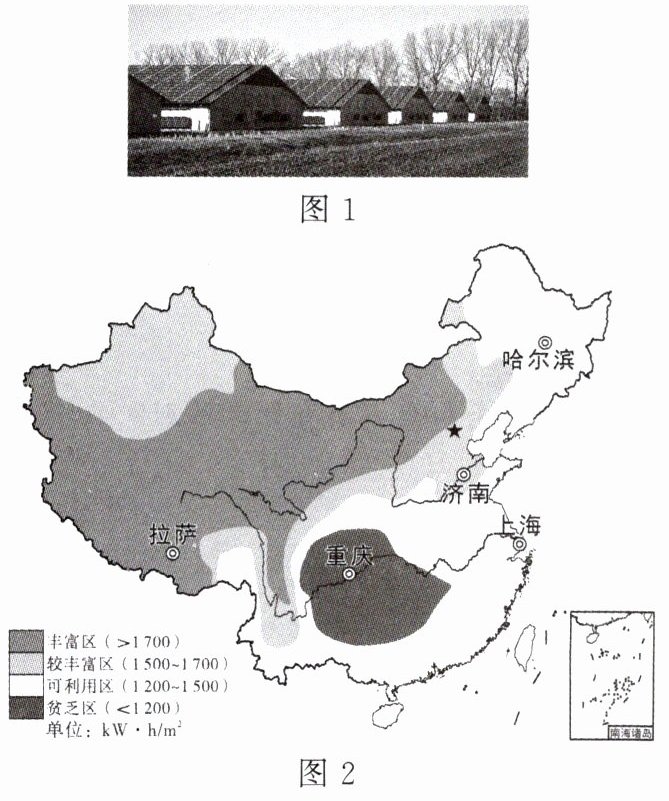 光伏扶贫是指发挥部分贫困地区太阳能资源丰富的优势,在屋顶和农业大棚上铺设太阳能电池板,充分利用太阳能资源从而实现精准扶贫的目的。图1为光伏发电的景观图,图2为我国年太阳总辐射量分布图。据此完成1~2题。