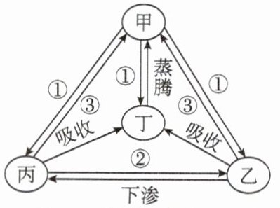 @@A 解析:第1题,据图可知,丁指向甲通过蒸腾作用,说明丁为生物圈,甲是大气圈;乙指向丙通过下渗作用,说明乙为水圈,丙为岩石圈。故选B。第2题,据上题可知,乙圈层为水圈,水圈是一个连续但分布不规则的圈层;水圈由呈固态、液态、气态分布于海洋、陆地、大气中的各种水体共同组成。故选A。