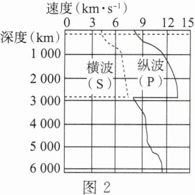 2.读图2,下列关于地球内部地震波波速变化说法,正确是( )