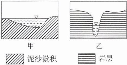 下图为我国某条大河甲、乙两段的河谷剖面示意图。读图,完成1~2题。