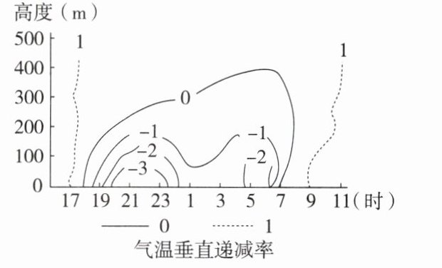 - 气温垂直递减率是指空气温度在垂直方向上随高度升高而降低的数值。读“某地春季某日气温垂直递减率(℃/100 m)时空变化图”,回答1~3题。