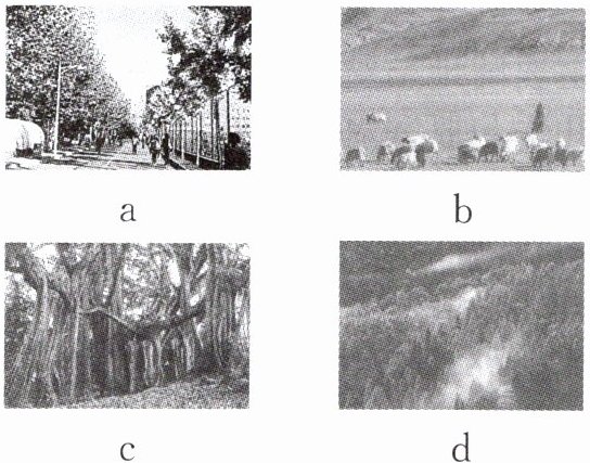 1. C 2. C 解析:第1题,根据图中景观可知,a表示温带落叶阔叶林,b表示温带草原,c表示热带雨林,d表示亚寒带针叶林。故选C。第2题,a表示温带落叶阔叶林,植被春季发叶,秋冬季落叶;b表示温带草原,所在区域气候类型主要为温带大陆性气候,气候偏干旱,风力强,植被具有耐旱、矮小等特点;c表示热带雨林,植被有板状根、茎花等现象;d表示亚寒带针叶林,植被树叶短小呈针状。故选C。