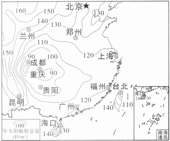 3. 仅考虑年太阳辐射总量的分布情况,假如你作为太阳能热水器的营销员,最适合营销的一组城市是( )
