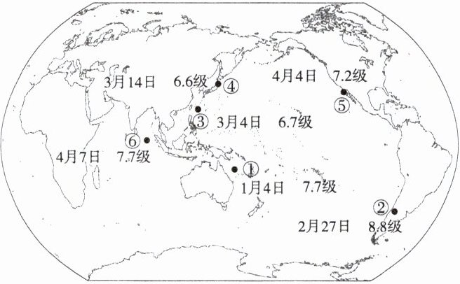 图中地震发生地①③⑤所处位置分别是太平洋板块与哪些板块的交界处?⑥位于哪条地震带上?