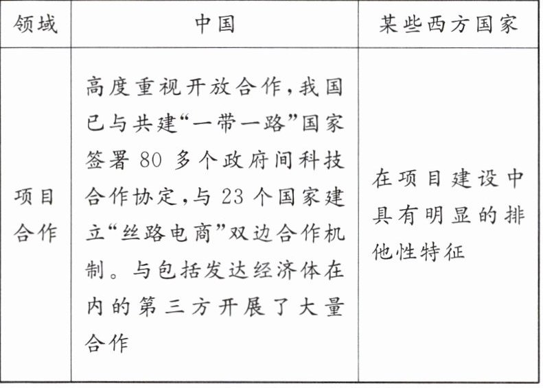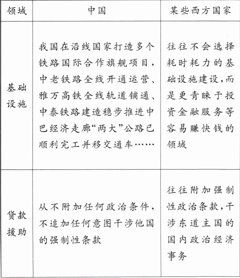 提示:①国际关系的决定性因素是国家利益和国家实力,国家间的共同利益是国家合作的基础,而利益对立是引起国家冲突的根源。中国与某些西方国家的国家性质不同,利益追求、对外政策也不同。中国在推进“一带一路”发展中高度重视与其他国家开放合作,互利共赢,而某些西方国家则一味追求“本国利益优先”。②和平与发展是当今时代的主题,中国在推进“一带一路”发展中,对很多国家进行贷款援助,不附加任何政治条件,有利于世界的和平与发展,有利于推动国际关系民主化;而某些西方国家奉行霸权主义和强权政治,干涉他国内政,这是和平与发展的主要障碍。③我国奉行独立自主的和平外交政策,构建人类命运共同体是我国外交思想的核心理念。中国在推进“一带一路”发展中,以实际行动推进“一带一路”国家的基础设施建设,展现了我国的世界情怀和全球视野,为新的国际秩序的构建贡献了中国智慧和中国方案。