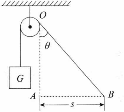 [解析] 拖车对绳子做的功等于绳子对重物做的功。以重物为研究对象,由于整个过程中重物匀速运动,所以绳子的拉力$F_T$=G。重物上升的距离等于滑轮右侧后来的绳长OB减去开始时的绳长OA,l = s / sinθ - s / tanθ = s(1 - cosθ) / sinθ,所以绳子对重物做的功W = G·l = s(1 - cosθ)G / sinθ。所以拖车对绳子做的功等于绳子对重物做的功,等于s(1 - cosθ)G / sinθ。