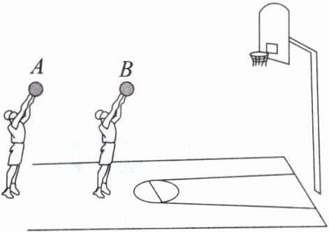D 解析:运用逆向思维,认为篮球从篮筐处以相同方向逆向斜抛,初速度越大,落点越远,所以$v_{A}>v_{B}$。分解速度可得$v_{Ay}>v_{By}$,$v_{Ax}>v_{Bx}$,相对于篮筐最大高度$H=\frac{v_{y}^{2}}{2g}$,则有$H_{A}>H_{B}$,高度决定时间,$t_{A}>t_{B}$,故A、B、C错误;由斜抛运动的对称性可知,A、B上升到与篮筐等高处时速度方向相同,故D正确。