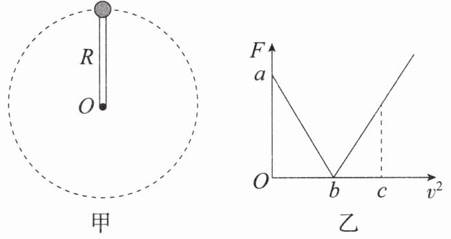 [训练 2] (2024·四川成都第七中学月考)如图甲所示,轻杆一端固定在$O$点,另一端固定一小球(可视为质点),现让小球在竖直平面内做半径为$R$的圆周运动。小球运动到最高点时,杆与小球间弹力大小为$F$,小球在最高点的速度大小为$v$,其$F - v^{2}$图像如图乙所示。不计空气阻力,则下列说法错误的是( )