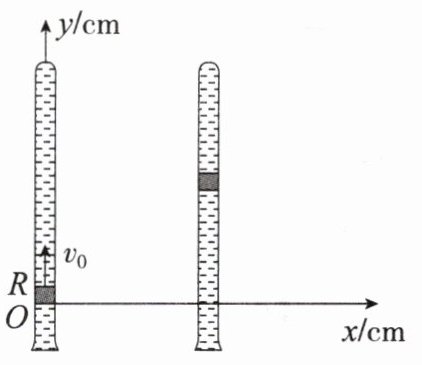 [典例1] (多选)如图所示,在一端封闭的光滑细玻璃管中注满清水,水中放一红蜡块R(R视为质点). 将玻璃管的开口端用橡胶塞塞紧后竖直倒置且与y轴重合,在R从坐标原点以速度$v_0 = 3\ cm/s$匀速上浮的同时,玻璃管沿x轴正方向做初速度为零的匀加速直线运动,R的合速度的方向与y轴正方向的夹角为$\alpha$. 则 ( )