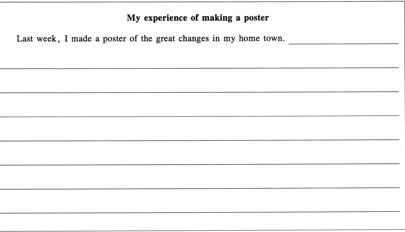One possible version: My experience of making a poster Last week, I made a poster of the great changes in my home town. The purpose of making it is to show the rapid development of my home town in recent years. Firstly, I asked my grandparents about their past living conditions. Then, I found some old photos online to compare the past and present of my home town. Finally, I sorted the information that I had learnt and designed a poster with some pictures. This experience helps me know better about my home town. With its development, people have led better lives and the environment has been improved. I am proud of my home town.