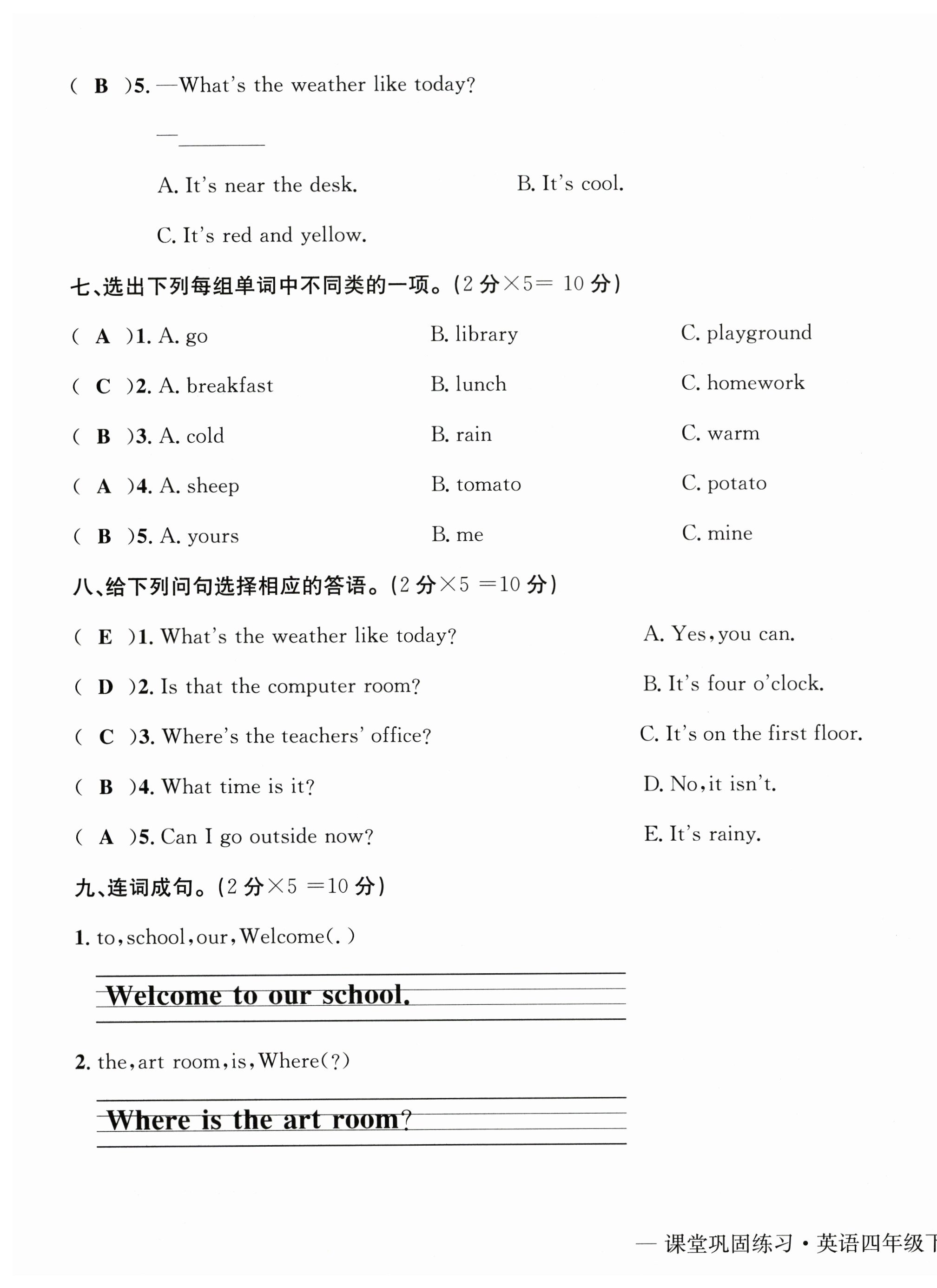注:目前有些书本章节名称可能整理的还不是很完善,但都是按照顺序排列的,请同学们按照顺序仔细查找。练习册 2025年课堂巩固练习四年级英语下册人教版 答案主要是用来给同学们做完题方便对答案用的,请勿直接抄袭。