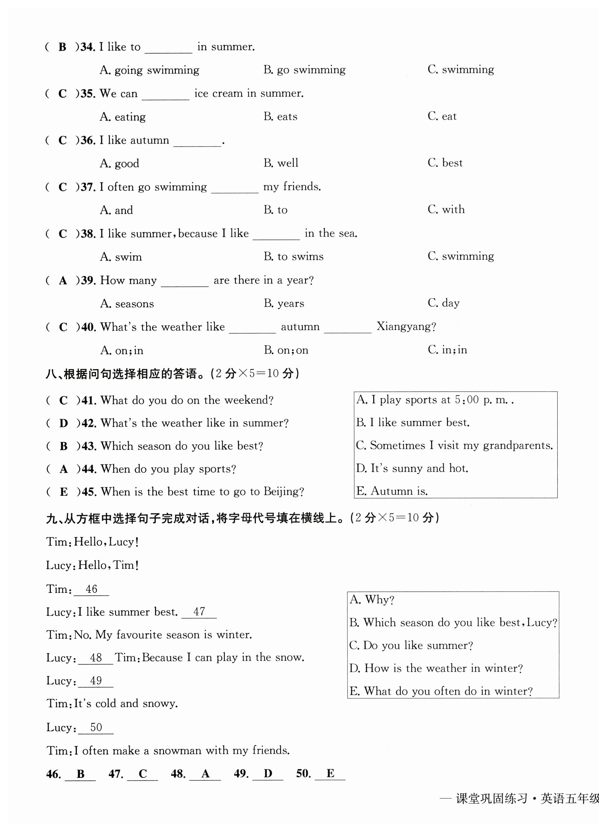 注:目前有些书本章节名称可能整理的还不是很完善,但都是按照顺序排列的,请同学们按照顺序仔细查找。练习册 2025年课堂巩固练习五年级英语下册人教版 答案主要是用来给同学们做完题方便对答案用的,请勿直接抄袭。