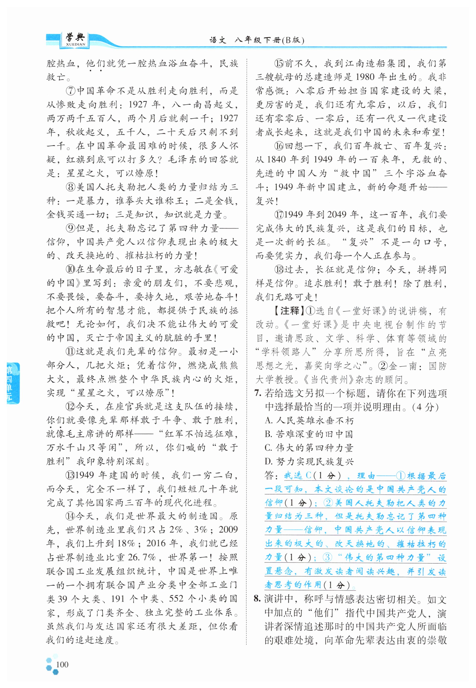 注:目前有些书本章节名称可能整理的还不是很完善,但都是按照顺序排列的,请同学们按照顺序仔细查找。练习册 2025年学典四川八年级语文下册人教版B版 答案主要是用来给同学们做完题方便对答案用的,请勿直接抄袭。