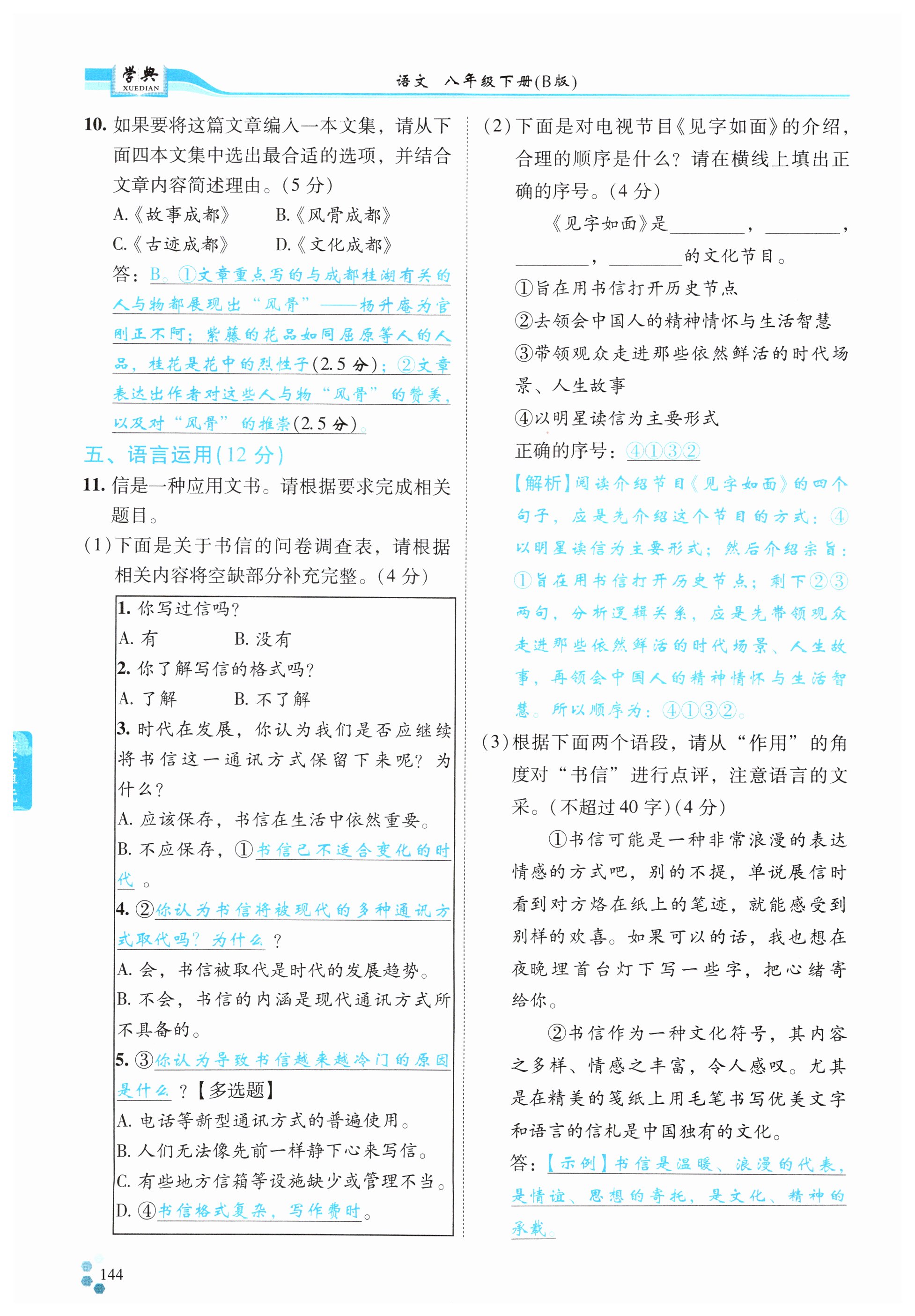 注:目前有些书本章节名称可能整理的还不是很完善,但都是按照顺序排列的,请同学们按照顺序仔细查找。练习册 2025年学典四川八年级语文下册人教版B版 答案主要是用来给同学们做完题方便对答案用的,请勿直接抄袭。