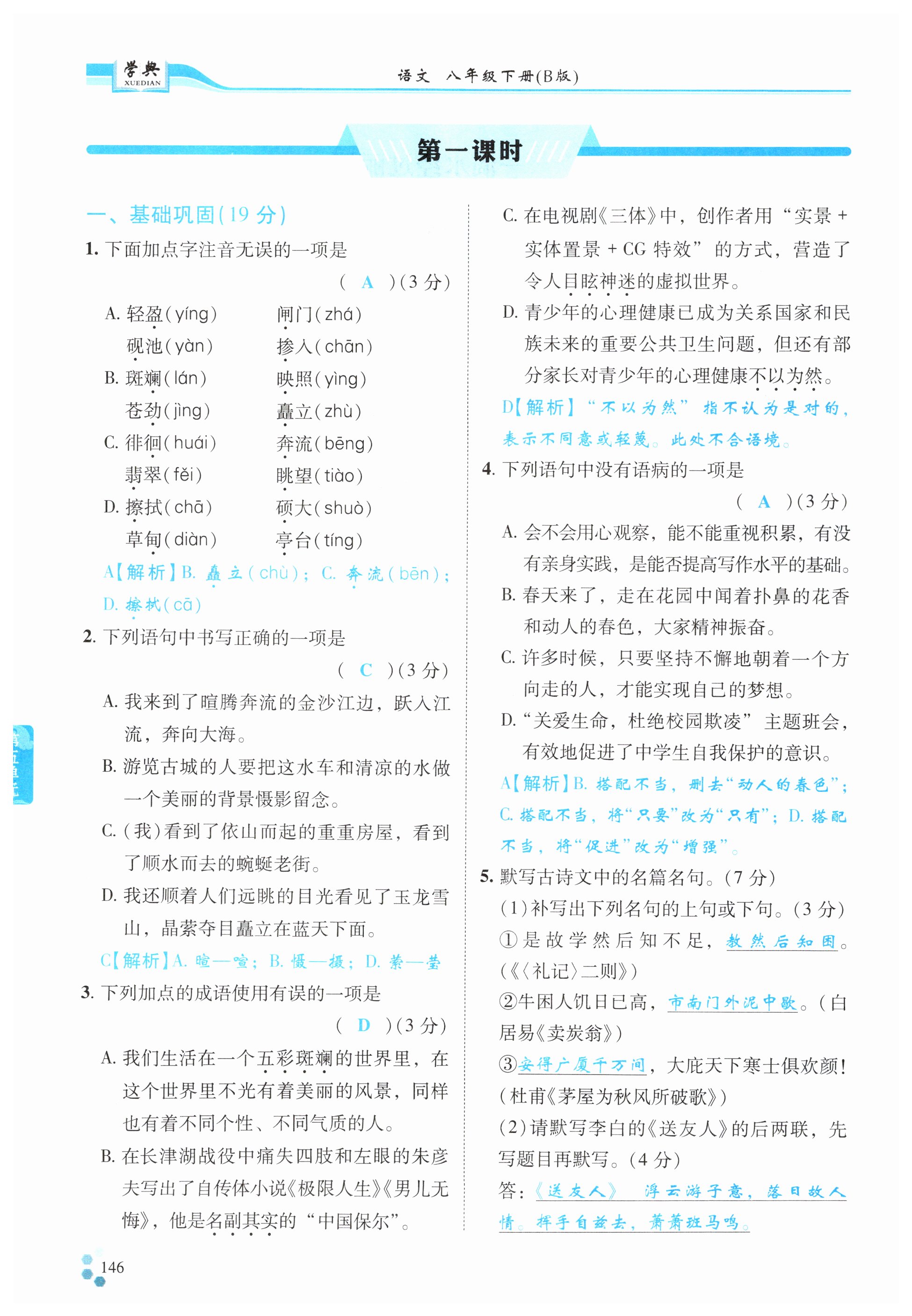 注:目前有些书本章节名称可能整理的还不是很完善,但都是按照顺序排列的,请同学们按照顺序仔细查找。练习册 2025年学典四川八年级语文下册人教版B版 答案主要是用来给同学们做完题方便对答案用的,请勿直接抄袭。