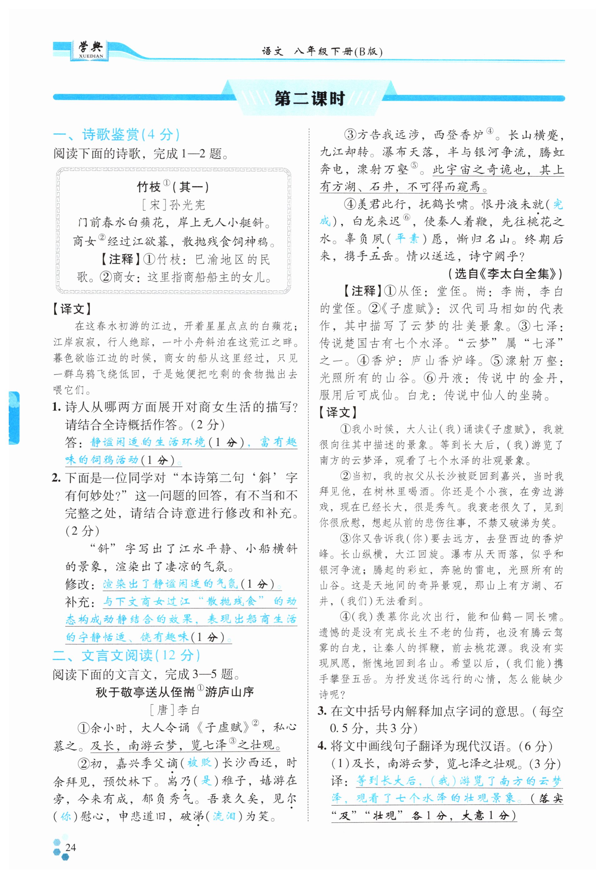注:目前有些书本章节名称可能整理的还不是很完善,但都是按照顺序排列的,请同学们按照顺序仔细查找。练习册 2025年学典四川八年级语文下册人教版B版 答案主要是用来给同学们做完题方便对答案用的,请勿直接抄袭。