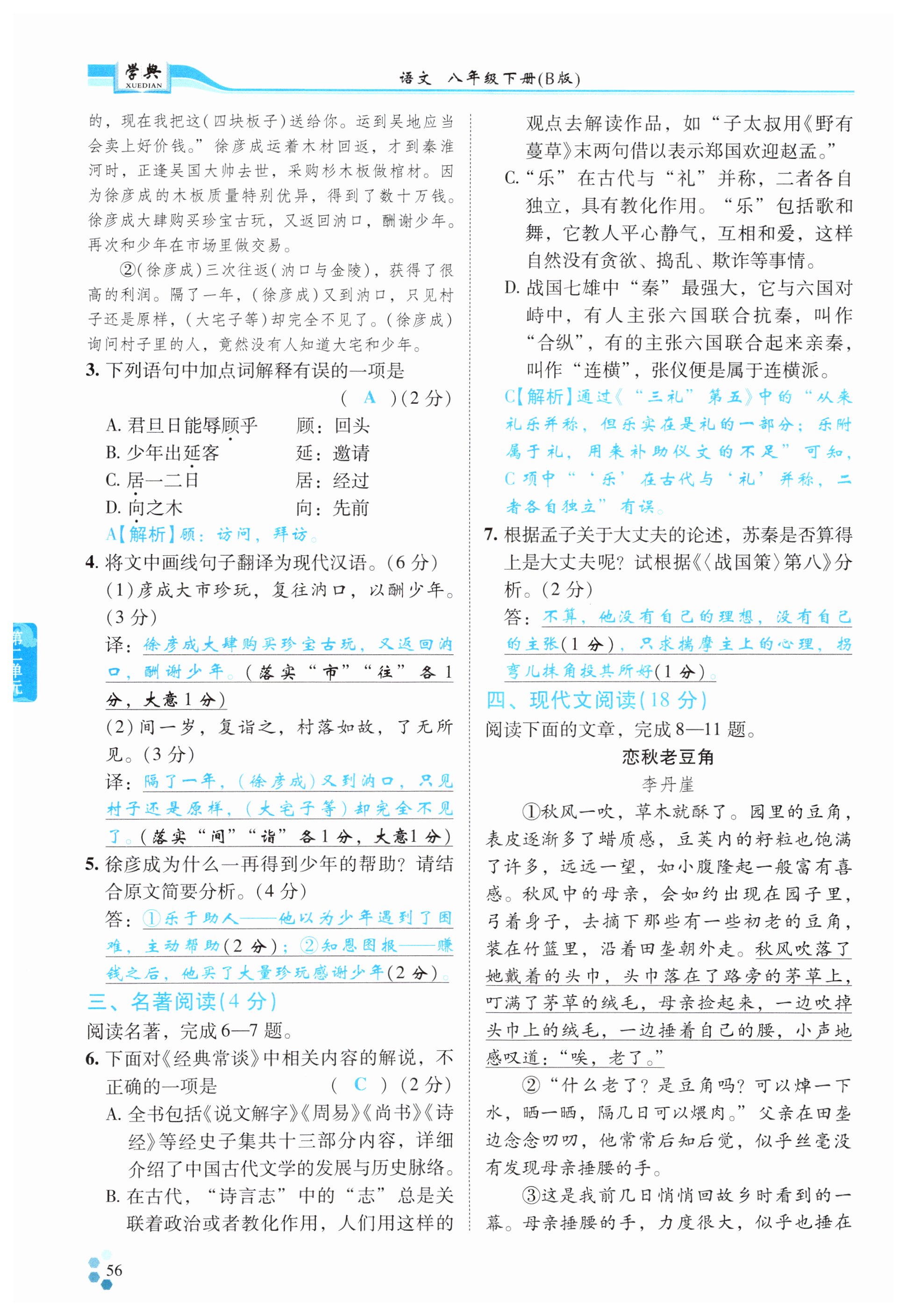 注:目前有些书本章节名称可能整理的还不是很完善,但都是按照顺序排列的,请同学们按照顺序仔细查找。练习册 2025年学典四川八年级语文下册人教版B版 答案主要是用来给同学们做完题方便对答案用的,请勿直接抄袭。