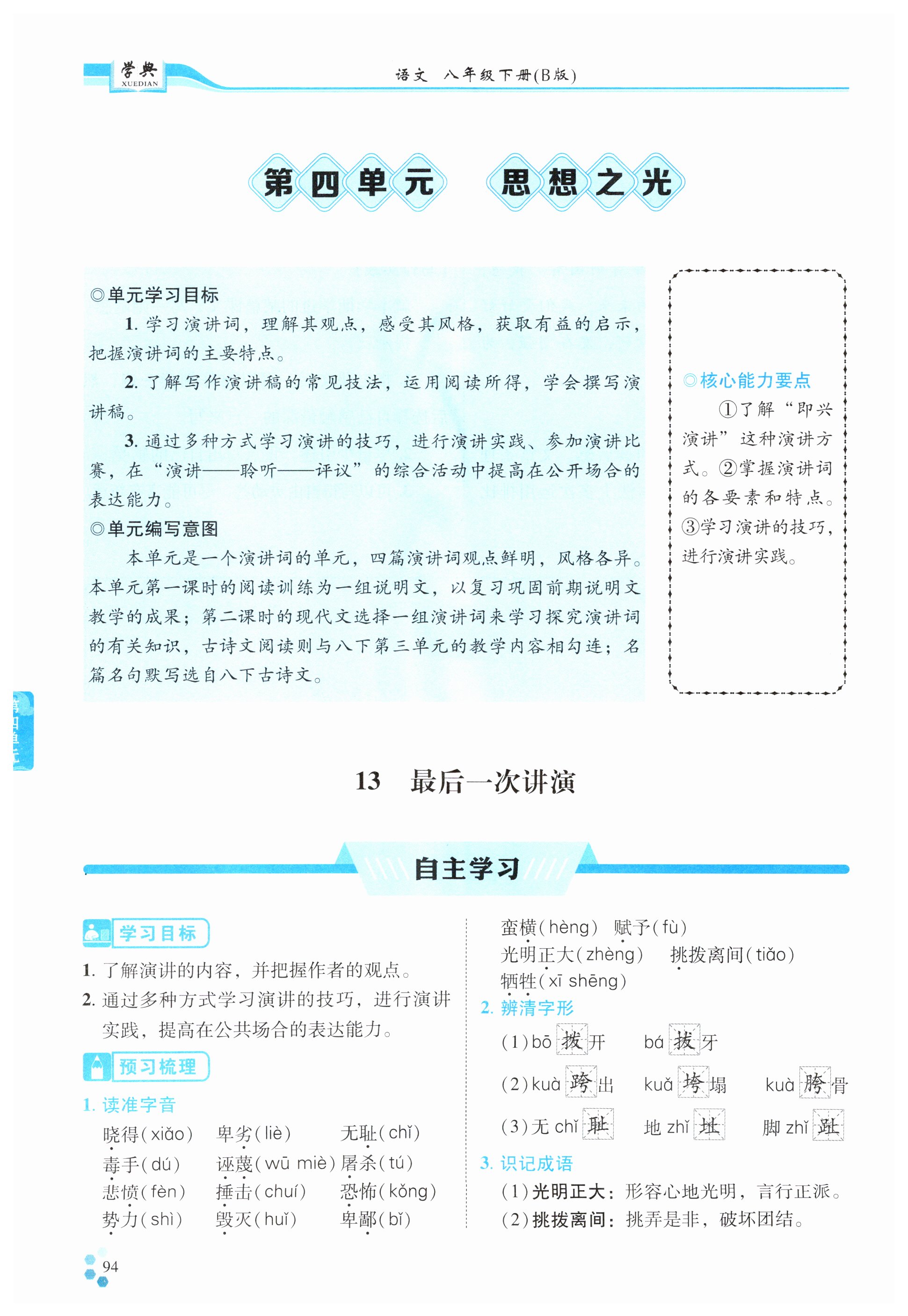 注:目前有些书本章节名称可能整理的还不是很完善,但都是按照顺序排列的,请同学们按照顺序仔细查找。练习册 2025年学典四川八年级语文下册人教版B版 答案主要是用来给同学们做完题方便对答案用的,请勿直接抄袭。