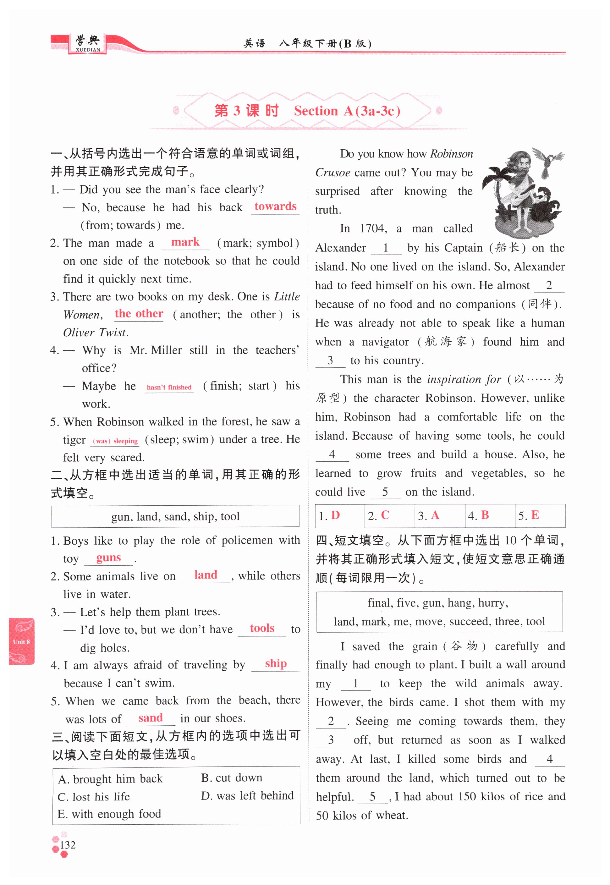 注:目前有些书本章节名称可能整理的还不是很完善,但都是按照顺序排列的,请同学们按照顺序仔细查找。练习册 2025年学典四川八年级英语下册人教版B版 答案主要是用来给同学们做完题方便对答案用的,请勿直接抄袭。