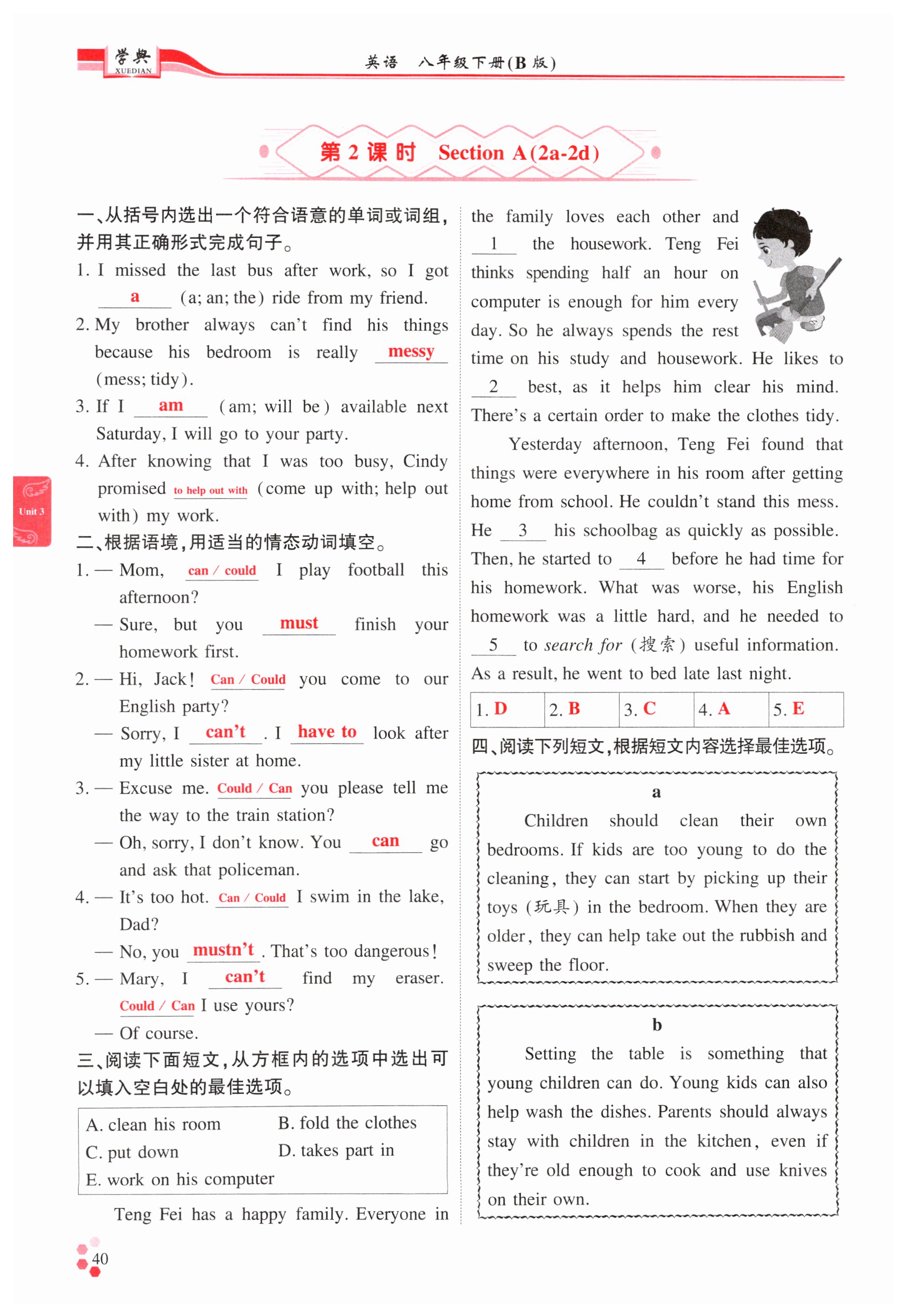注:目前有些书本章节名称可能整理的还不是很完善,但都是按照顺序排列的,请同学们按照顺序仔细查找。练习册 2025年学典四川八年级英语下册人教版B版 答案主要是用来给同学们做完题方便对答案用的,请勿直接抄袭。