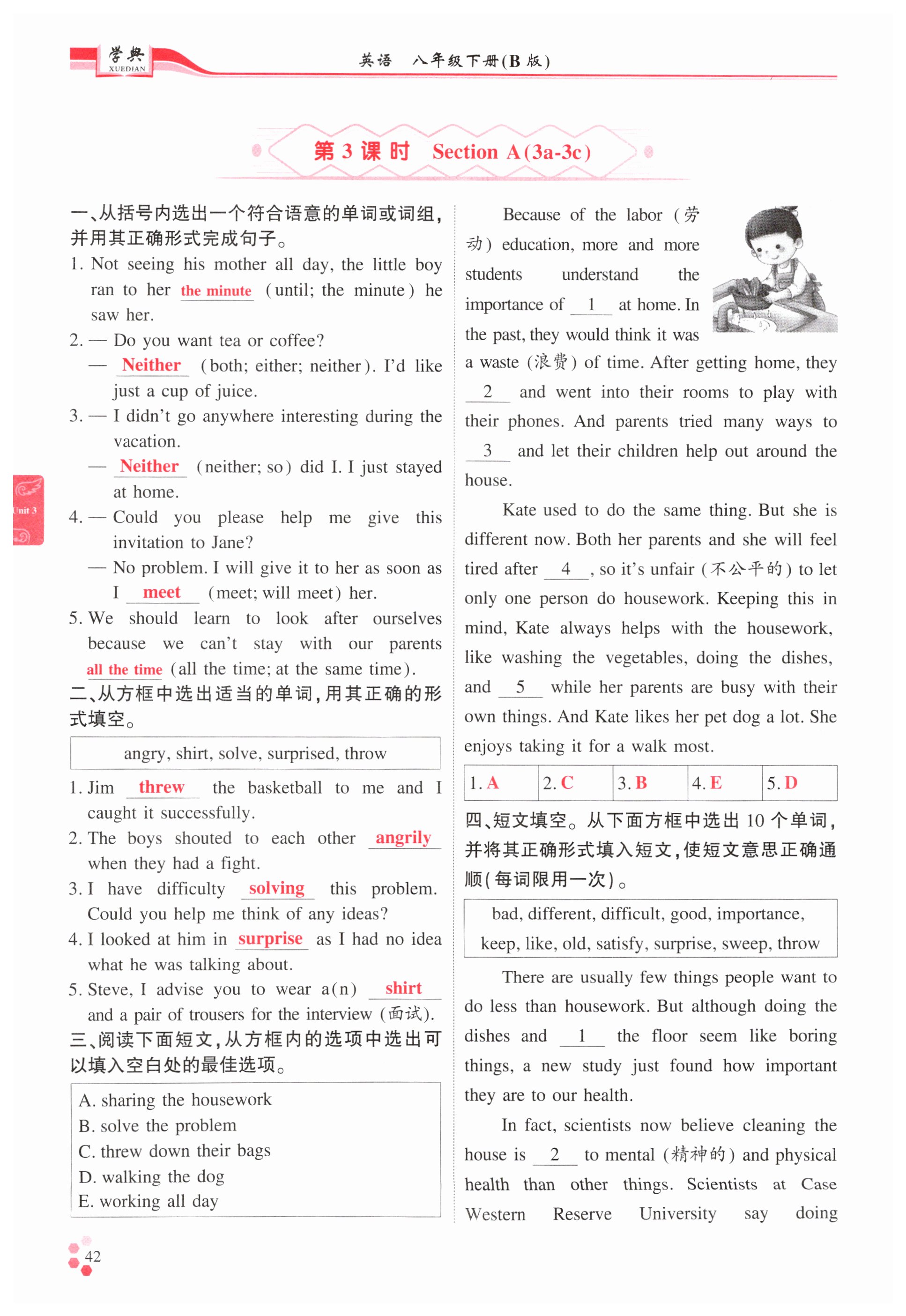 注:目前有些书本章节名称可能整理的还不是很完善,但都是按照顺序排列的,请同学们按照顺序仔细查找。练习册 2025年学典四川八年级英语下册人教版B版 答案主要是用来给同学们做完题方便对答案用的,请勿直接抄袭。