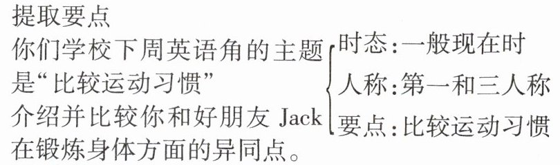 假如你是Tom,你们学校下周英语角的主题是“比较运动习惯”,请你用英语准备一篇60词左右的小短文,介绍并比较你和好朋友Jack在锻炼身体方面的异同点。