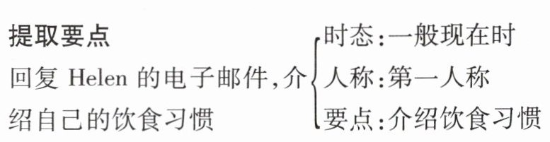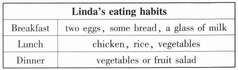 好的饮食习惯有利于我们的健康。假如你是Linda,你的美国笔友Helen发来一封电子邮件询问你的饮食习惯。请根据表格内容,回复Helen的电子邮件。