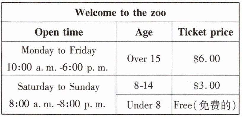 ( )45.[新考向][图文转换] On Sunday, the zoo opens at ________.