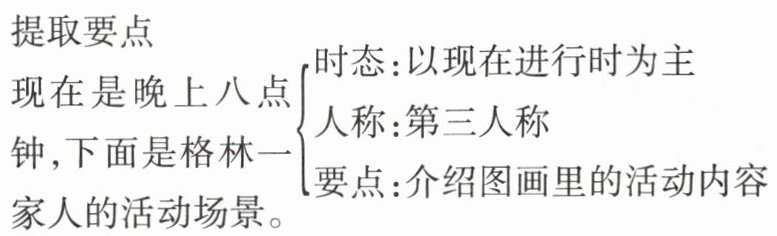 现在是晚上八点钟,下面是格林一家人的活动场景。请你根据图画内容用英语写一篇60词左右的短文进行描述。