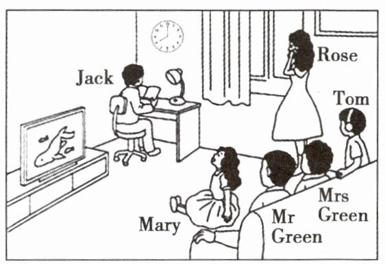 Here is¹ a picture of their family. Look! Mr and Mrs Green are watching² a TV show on the sofa. Who is the girl on the floor? She is Mary. She is also watching² the TV show with her parents because she thinks the show is very interesting. The tall girl is Rose. She is talking² on the phone with her friend. Look! Jack is reading² a book. He likes reading a lot. What's Tom doing? He's listening² to music.