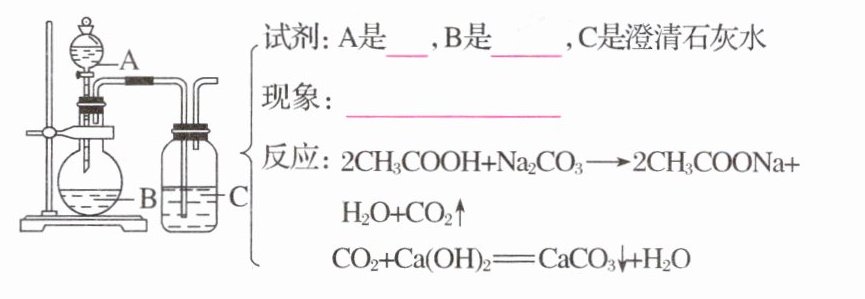 3. (1)①$CH_{3}COOH\rightleftharpoons CH_{3}COO^{-}+H^{+}$;②醋酸与碳酸钠溶液反应,澄清石灰水变浑浊。(2)①酯和水;②可逆、缓慢;③乙酸乙酯是无色透明的油状液体,有香味,乙酸和乙醇反应的化学方程式为$CH_{3}COOH + CH_{3}CH_{2}OH\underset{\triangle }{\overset{浓硫酸}{\rightleftharpoons }}CH_{3}COOC_{2}H_{5}+H_{2}O$。