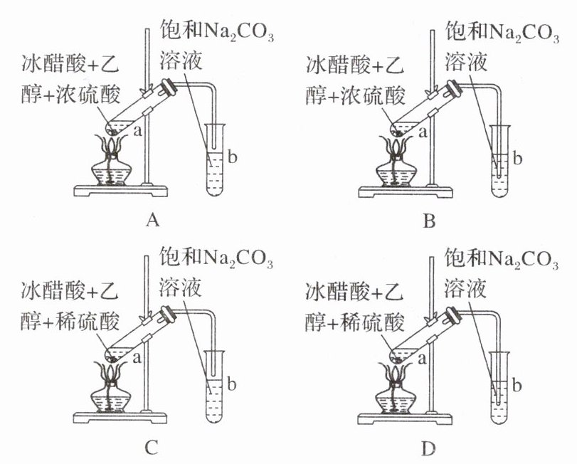A [制乙酸乙酯时,应选择浓$H_{2}SO_{4}$作催化剂和吸水剂,且导管末端应位于饱和$Na_{2}CO_{3}$溶液上方,以防止倒吸,故B、C、D项错误。]