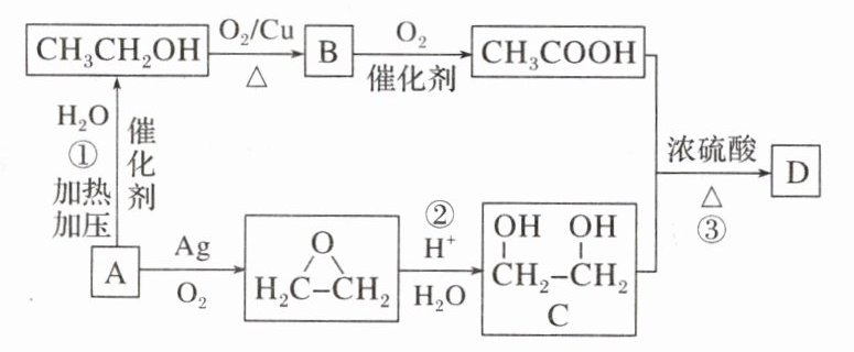 解析:A和水发生加成反应生成$CH_{3}CH_{2}OH$,A被氧化生成环氧乙烷,则A为$CH_{2}=CH_{2}$,乙醇发生催化氧化生成的B为$CH_{3}CHO$,乙醛被氧化生成$CH_{3}COOH$,环氧乙烷在酸性条件下水解生成乙二醇,乙酸和乙二醇在浓硫酸作催化剂、加热条件下发生酯化反应生成D,据此解答。\n(1)A为$CH_{2}=CH_{2}$,在标准状况下,烃A的密度约为28 g/mol÷22.4 L/mol = 1.25 g·L⁻¹;\n(2)反应①是乙烯与水发生加成反应生成乙醇;反应③是乙酸与乙二醇发生酯化反应生成D,也属于取代反应;\n(3)$HOCH_{2}CH_{2}OH$中醇羟基能和Na反应生成$NaOCH_{2}CH_{2}ONa$和氢气,反应的化学方程式为$HOCH_{2}CH_{2}OH + 2Na\longrightarrow NaOCH_{2}CH_{2}ONa + H_{2}\uparrow$;\n(4)$CH_{3}CH_{2}OH$发生催化氧化生成$CH_{3}CHO$,反应方程式为$2CH_{3}CH_{2}OH + O_{2}\xrightarrow[\triangle ]{Cu}2CH_{3}CHO + 2H_{2}O$;\n(5)$CH_{3}COOH$与乙二醇按物质的量2∶1发生酯化反应生成D,则D的结构简式为$CH_{3}COOCH_{2}CH_{2}OOCCH_{3}$;\n(6)A.物质C为$HOCH_{2}CH_{2}OH$,与$CH_{3}CH_{2}OH$含有羟基数目不相等,二者不是同系物,故A错误;B.D的结构简式为$CH_{3}COOCH_{2}CH_{2}OOCCH_{3}$,在酸性条件下水解生成$HOCH_{2}CH_{2}OH$和$CH_{3}COOH$,故B正确;C.A为$CH_{2}=CH_{2}$,含有碳碳双键,B为$CH_{3}CHO$,含有醛基,C为$HOCH_{2}CH_{2}OH$,含有羟基,都可以被酸性高锰酸钾溶液氧化,能使酸性高锰酸钾溶液褪色,故C正确;D.乙烯与氯气发生加成反应生成$ClCH_{2}CH_{2}Cl$,其同分异构体只有$CH_{3}CHCl_{2}$,故D正确。