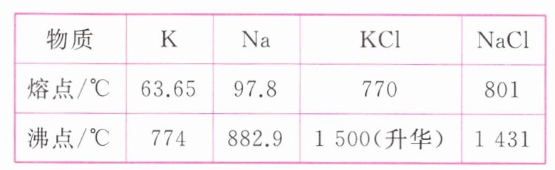 6.金属K与Na金属性相近,用K与钠盐共熔时,很难将Na从混合物中分离。若调整温度到一定程度,则可用Na与KCl反应制取金属K。已知四种物质的熔、沸点如下: