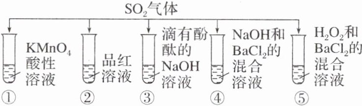 (4) 二氧化硫和氢氧化钠生成亚硫酸钠,亚硫酸钠和氯化钡生成亚硫酸钡白色沉淀,故试管④中的实验现象:溶液变浑浊生成白色沉淀,该反应的离子方程式:SO₂ + 2OH⁻ + Ba²⁺$\xlongequal{}$BaSO₃↓ + H₂O。 答案