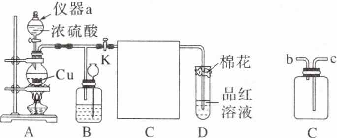 (2) 二氧化硫密度大于空气,应该使用向上排空气法收集,装置C中应该长进短出,故按从左往右的顺序装置C应该先接c,当D中出现品红溶液红色褪去的现象时,证明气体已集满,停止加热。二氧化硫有毒且能和氢氧化钠反应,装置D中试管口的棉花应提前在氢氧化钠溶液中浸湿,其作用是吸收尾气,减少污染;