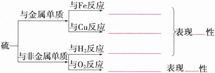 硫$\begin{cases}与金属单质\begin{cases}与Fe反应\_\_\_\_\_\_\\与Cu反应\_\_\_\_\_\_\end{cases}\\与非金属单质\begin{cases}与H₂反应\_\_\_\_\_\_\\与O₂反应\_\_\_\_\_\_\end{cases}\end{cases}$表现___性 表现___性